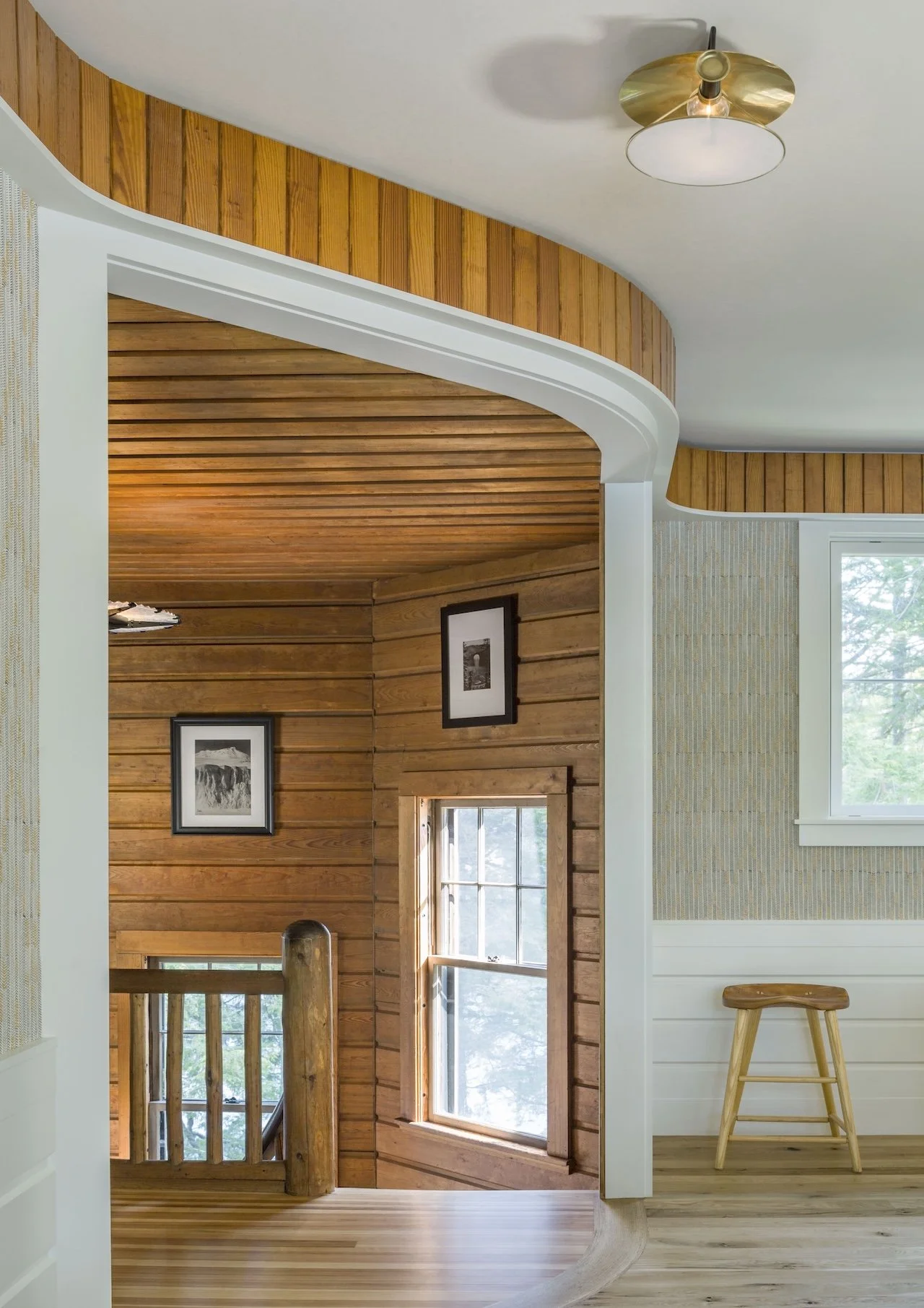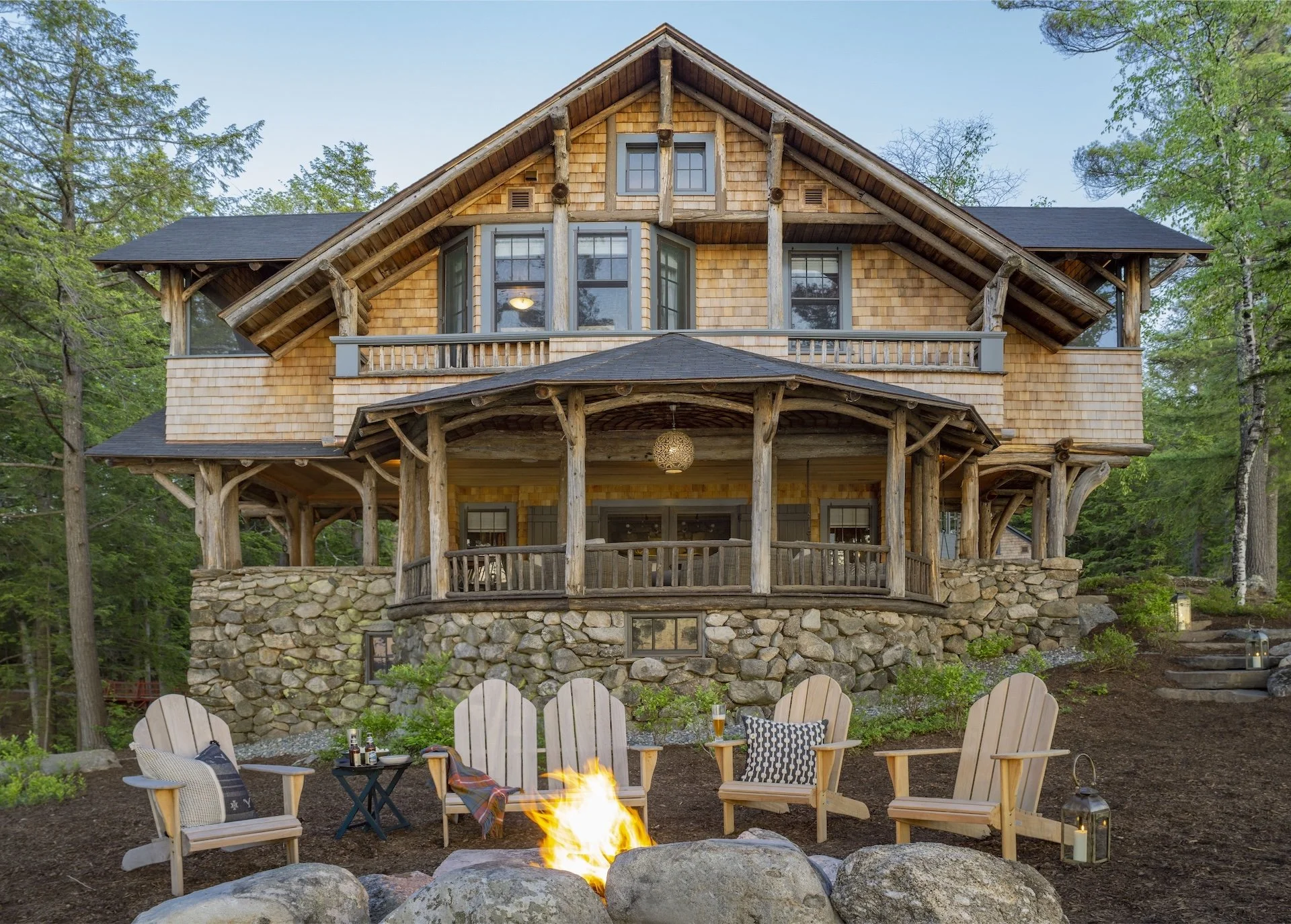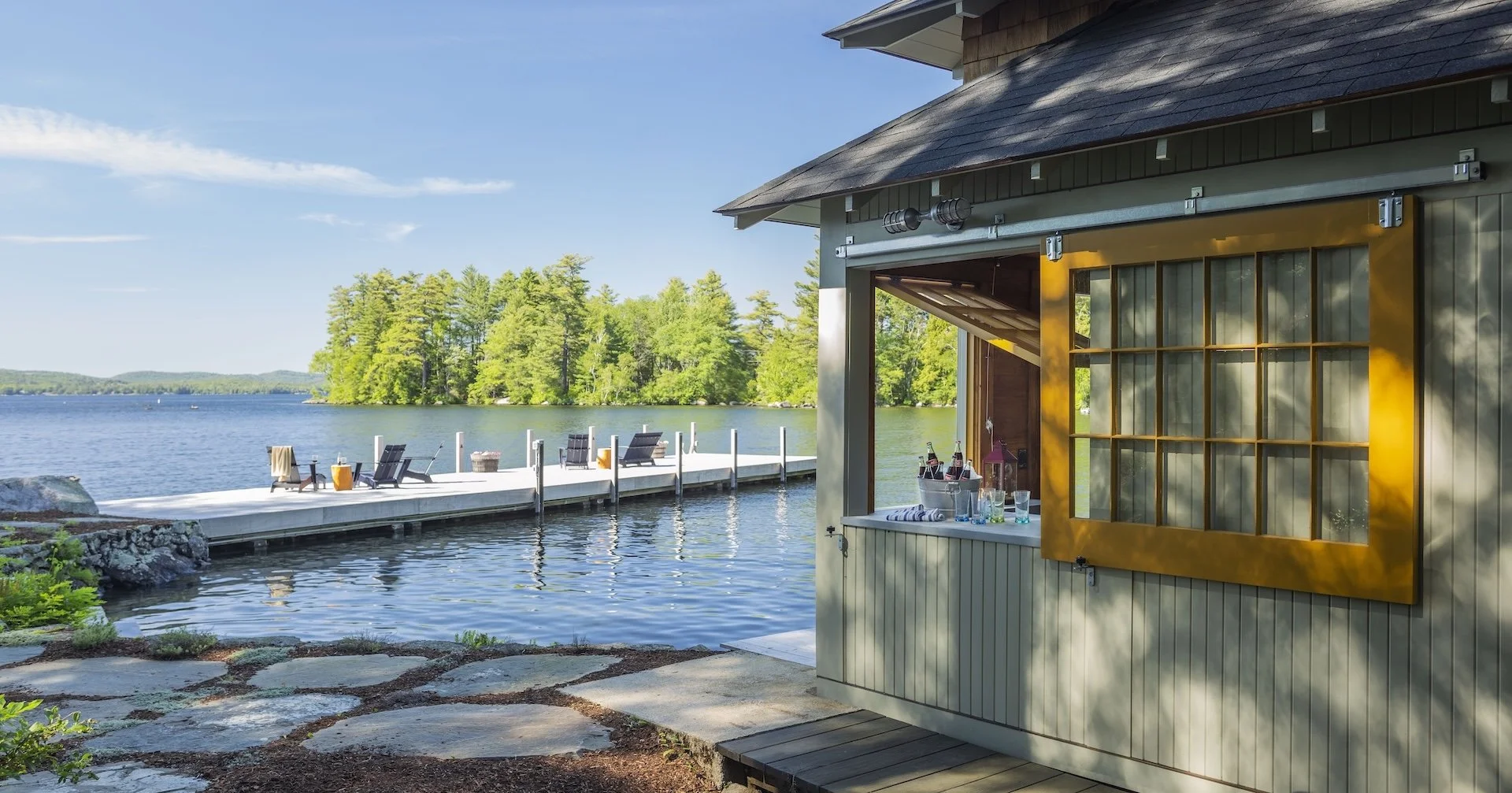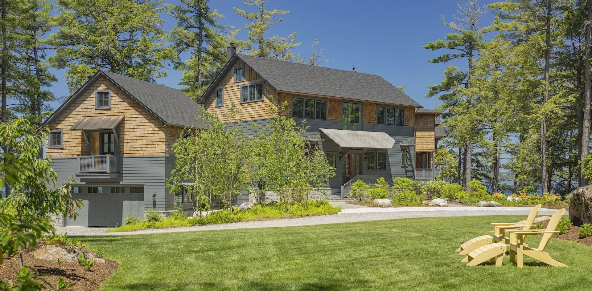 Originally built in the 1920s as a hunting and fishing lodge, this Adirondack-style home sits on a prominent point in Newbury, New Hampshire. The charm of the original structure has been thoughtfully restored, and a contemporary two-story addition replaces a one-story wing added in the 1970s, seamlessly blending old and new. As part of the renovation, a worn boathouse on the water’s edge was reimagined to include a gathering space that connects indoor and outdoor living. Both the house and boathouse take full advantage of breathtaking lake views and the surrounding landscape, creating a perfect retreat for a growing circle of family and friends.