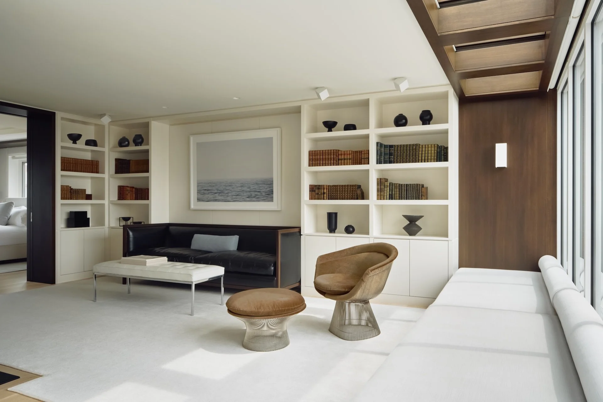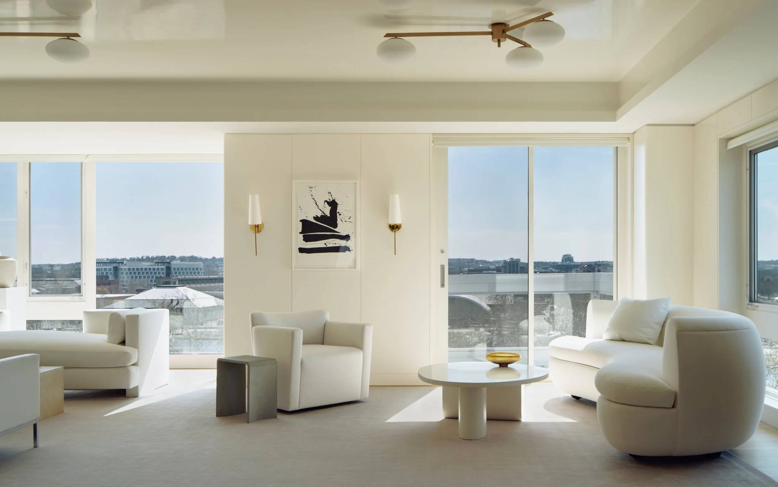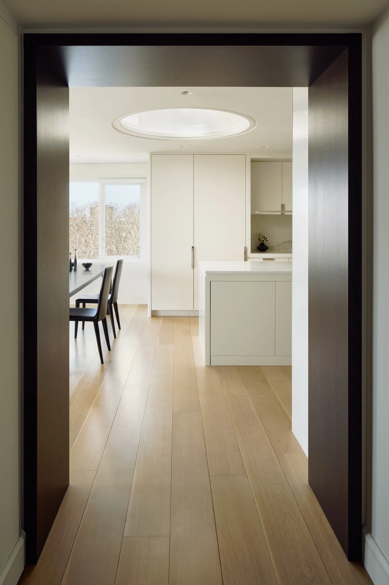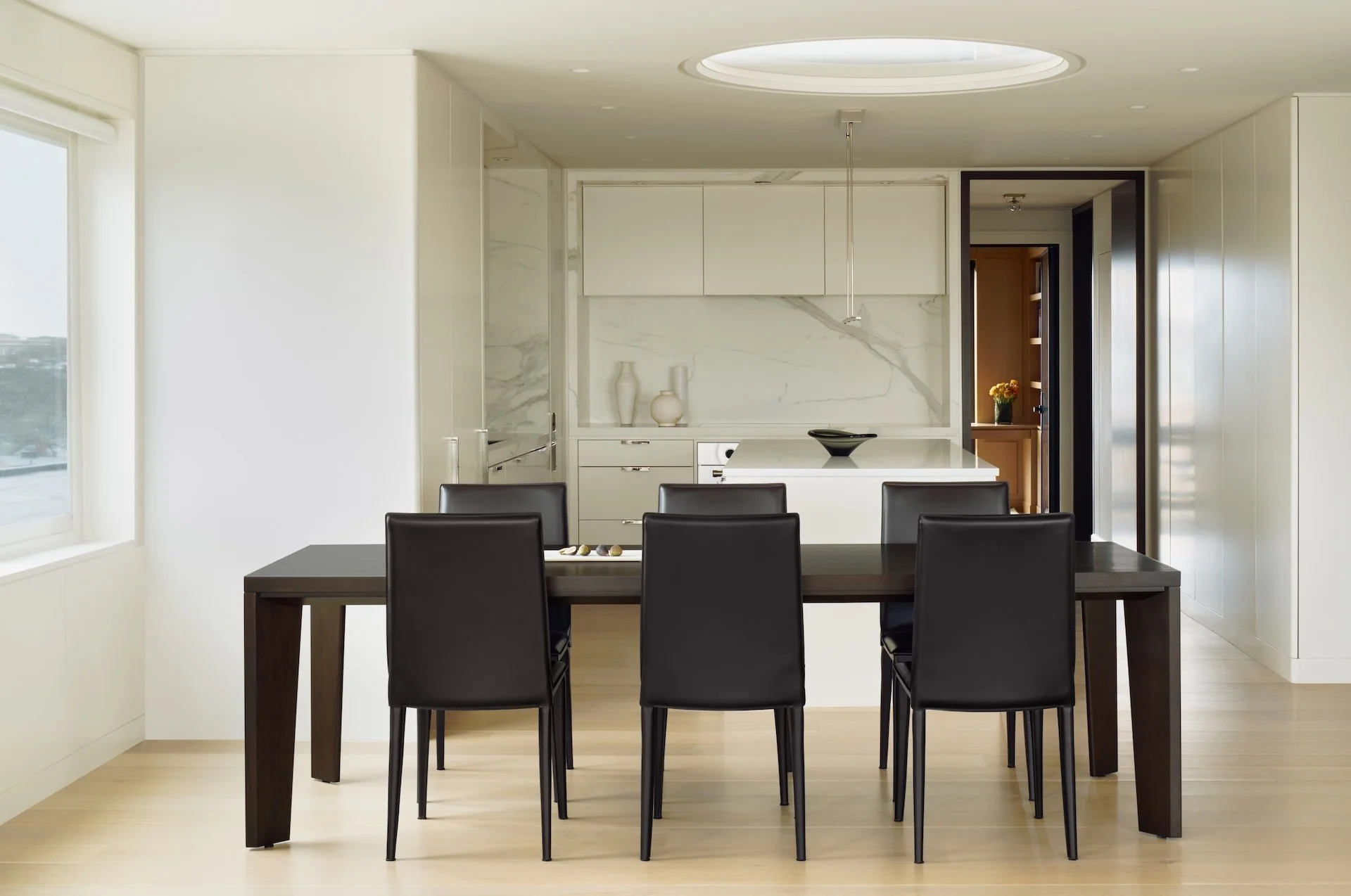 This modern penthouse apartment with generous views of the Charles River embraces light, warmth, and refined detailing. Off-white walls and ceilings create a bright backdrop, while walnut and elm accents add richness and depth. Rift and quartered white oak flooring runs throughout, and expansive windows flood the interior with natural light.