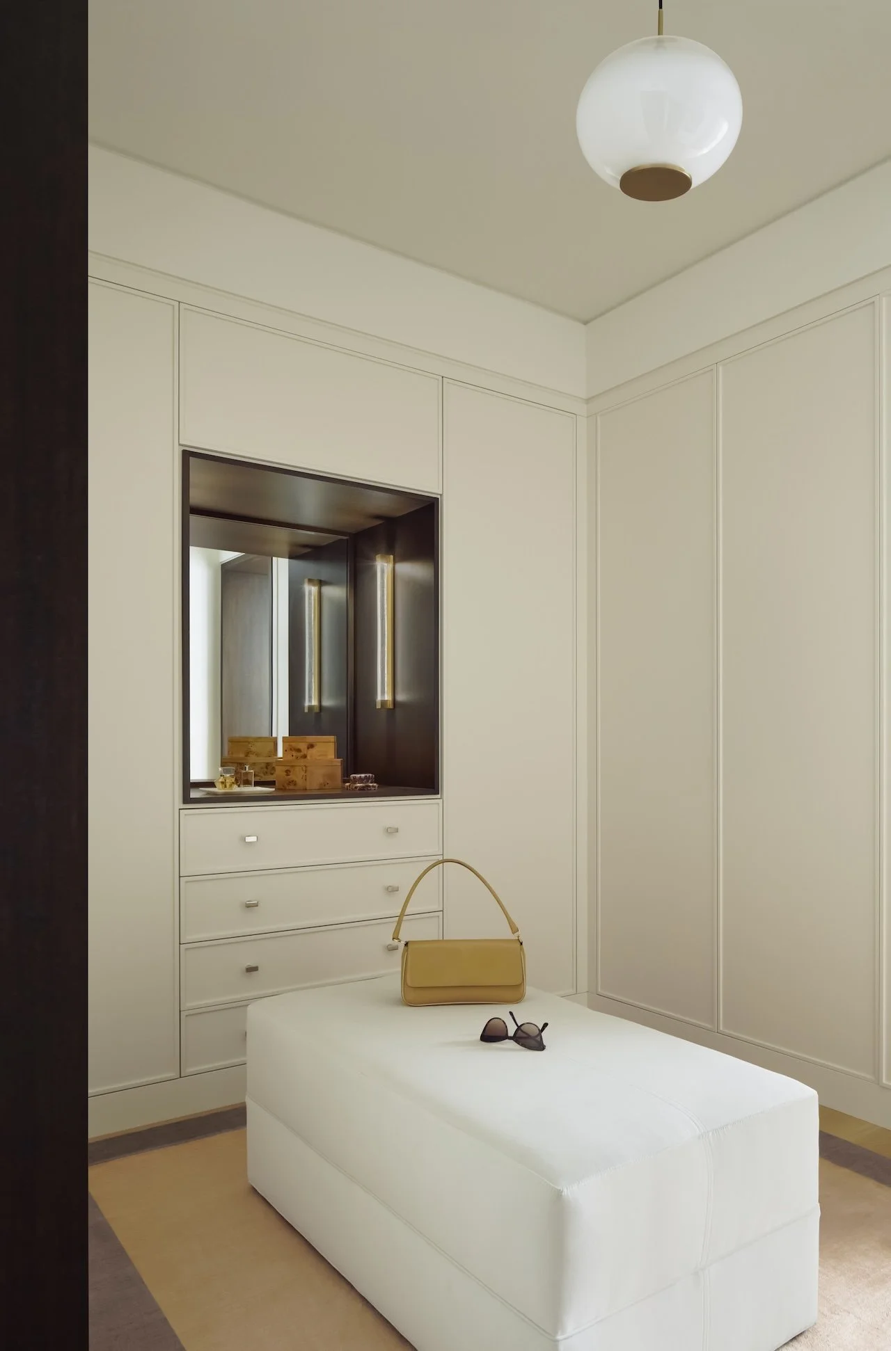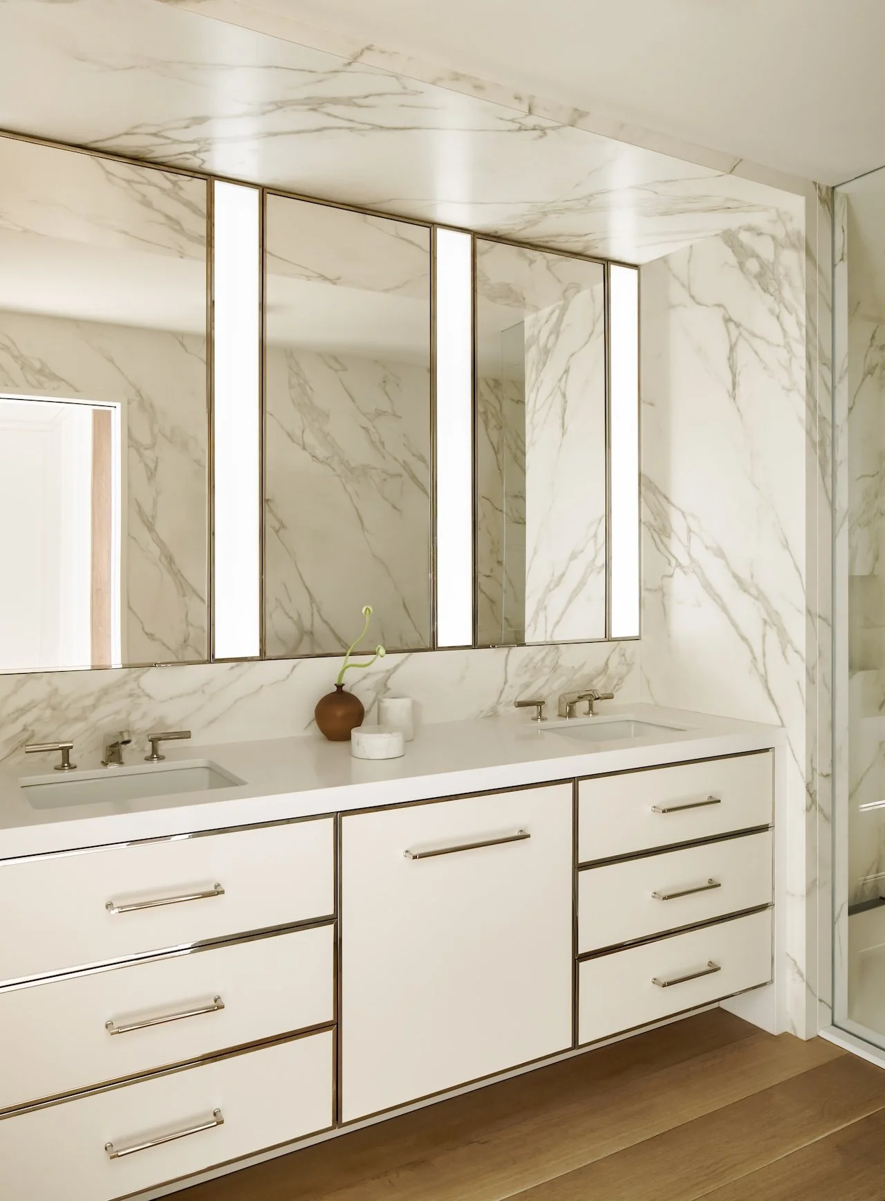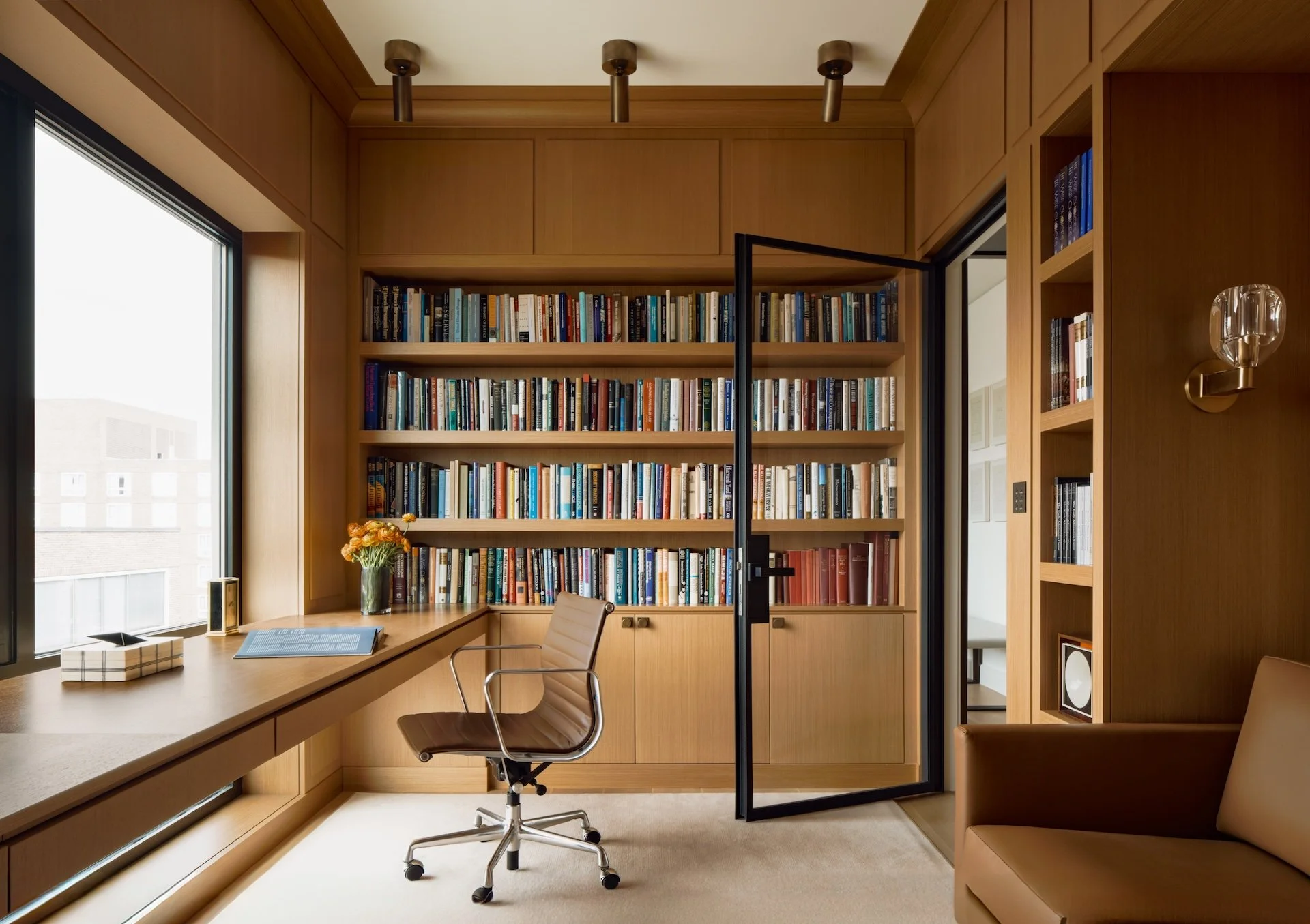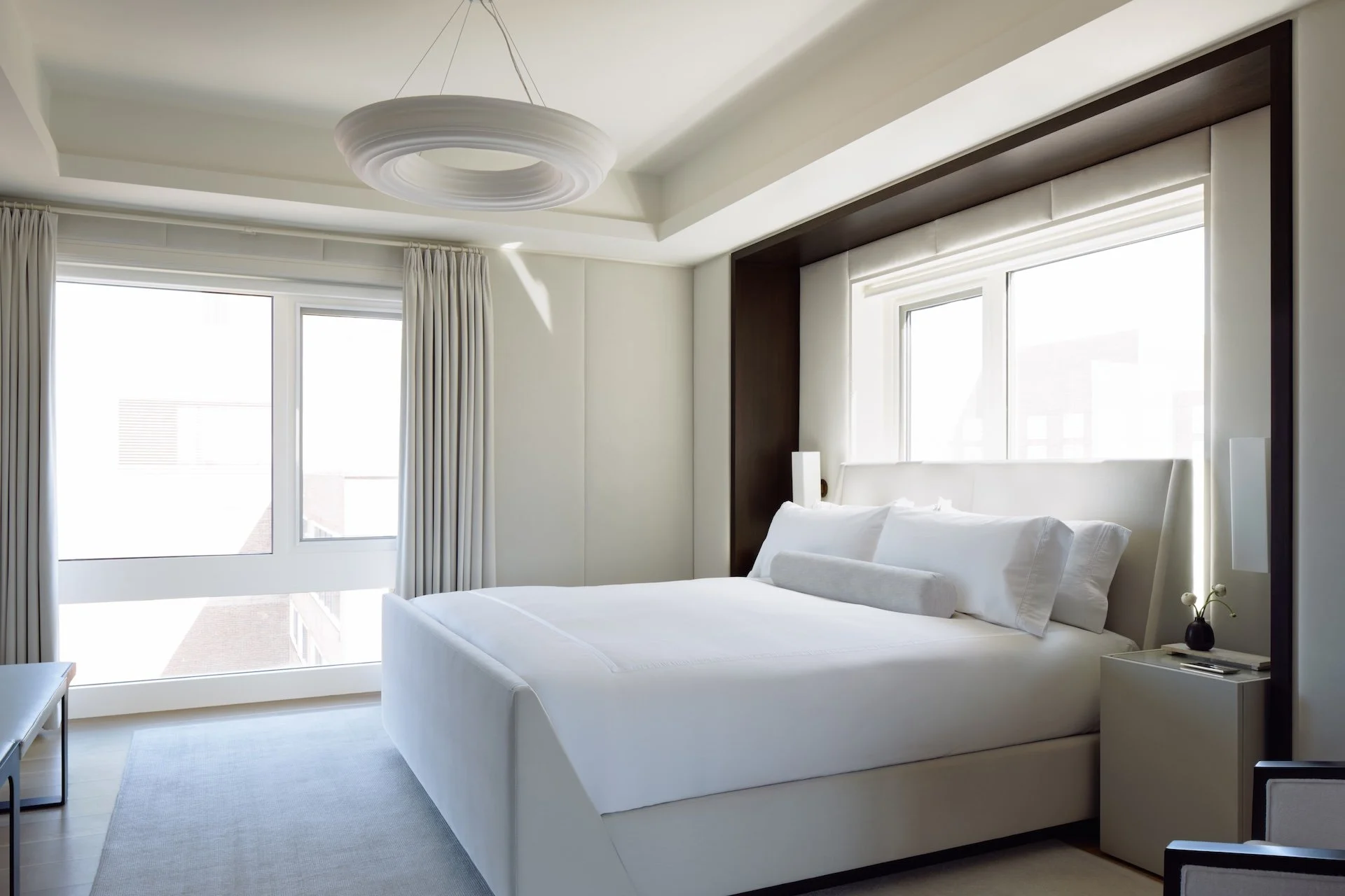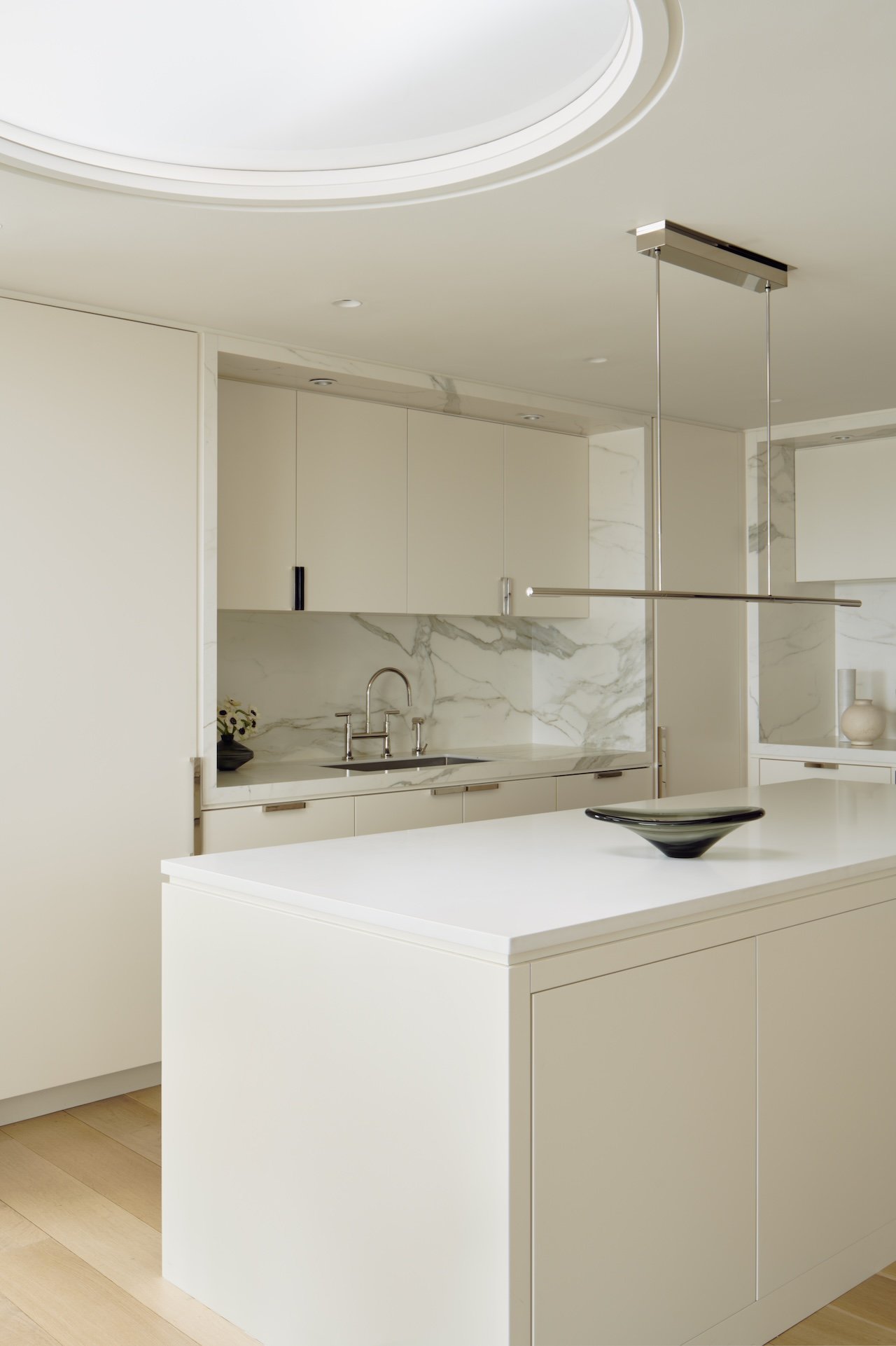 This modern penthouse apartment with generous views of the Charles River embraces light, warmth, and refined detailing. Off-white walls and ceilings create a bright backdrop, while walnut and elm accents add richness and depth. Rift and quartered white oak flooring runs throughout, and expansive windows flood the interior with natural light.